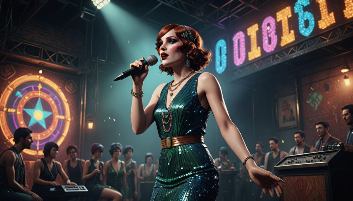 This image shows a stunning woman in a short sequined flapper dress, singing into a vintage microphone on a smoky nightclub stage, with intricate 3D graphics and vibrant colors.