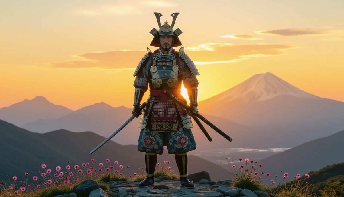 A striking picture of a majestic samurai warrior on a mountaintop at sunrise. Bathed in golden light, the figure is adorned in traditional armor amid a backdrop of mountains, rendered with dynamic lighting and intricate detail.