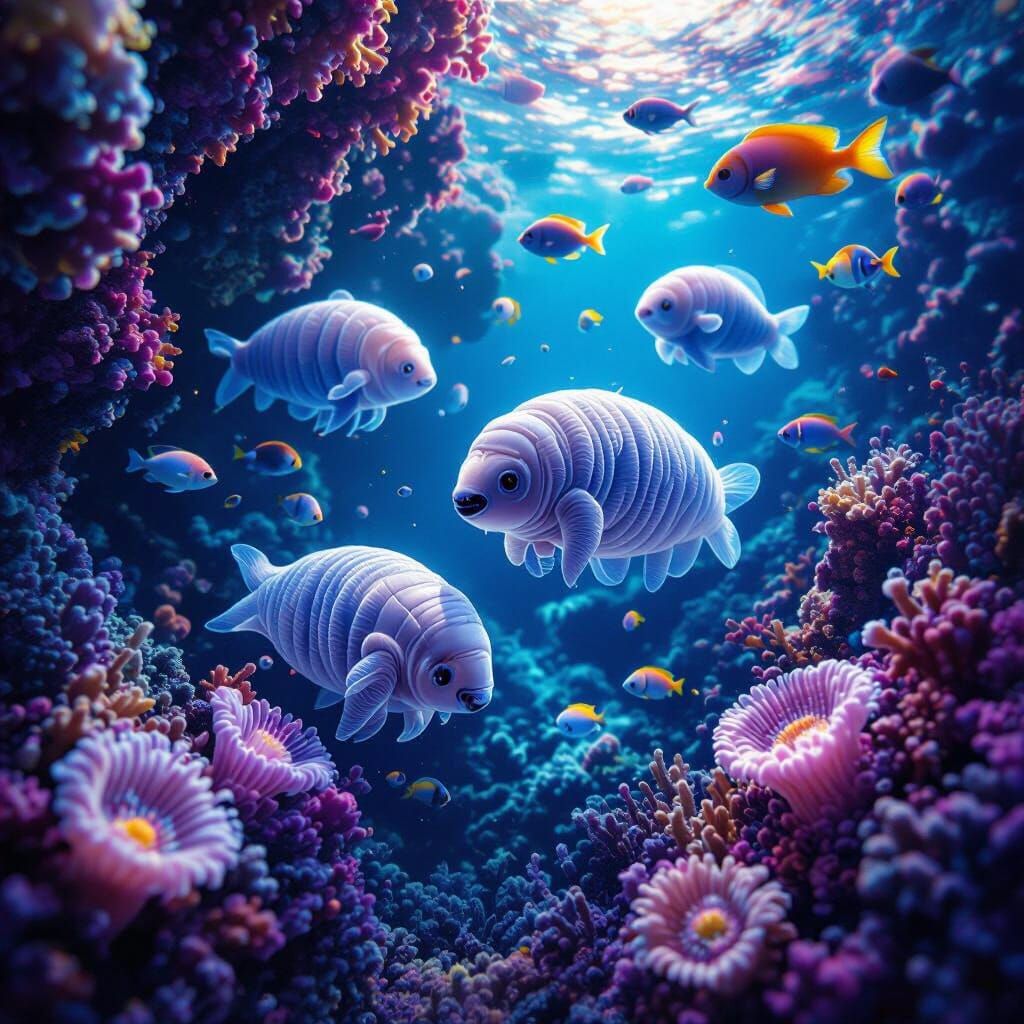 This hyperrealistic macro photo shows giant tardigrades in a colorful coral reef with fish and anemones. Dramatic lighting and bioluminescence create an otherworldly atmosphere.
