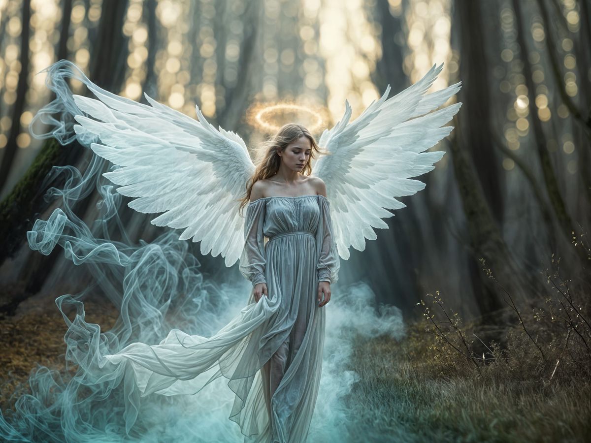 This image shows a vaporous angel figure fading into a woodland scene. The ethereal form has mist-like wings and a faint halo, set against soft light and a distant blue mountain.
