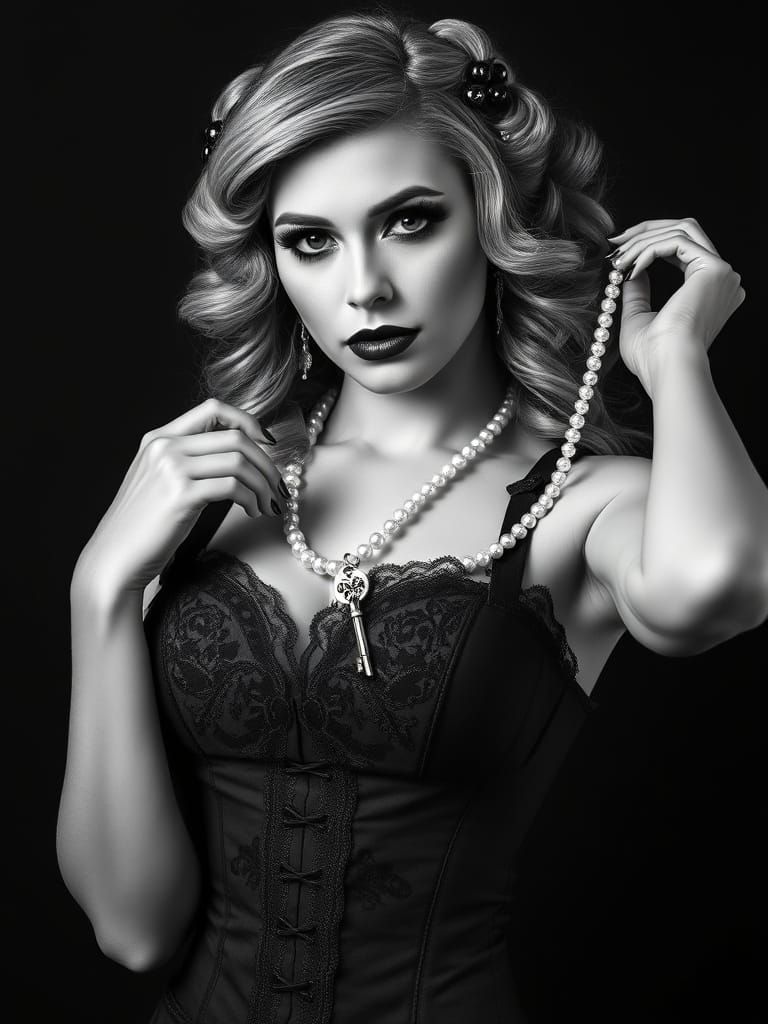 This image shows a glamorous woman in a vintage-style black and white portrait. She wears an elaborate corset and holds a pearl necklace with a key pendant, presented as a timeless photograph.