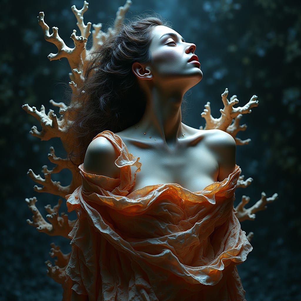 A captivating image of a woman enshrouded within cracked coral and stained glass. The flowing silk ribbon and triadic colors create a surreal, hyper-detailed portrait with dynamic lighting.