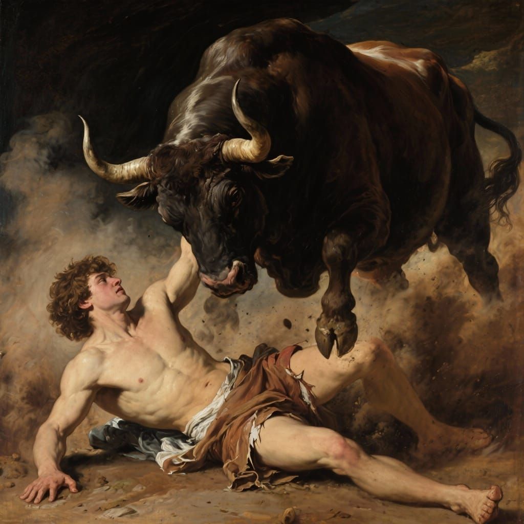 This Renaissance oil painting depicts a dramatic struggle between a muscular Theseus and a powerful bull. Chiaroscuro lighting and an earthy palette enhance the epic scene of raw power and tension.