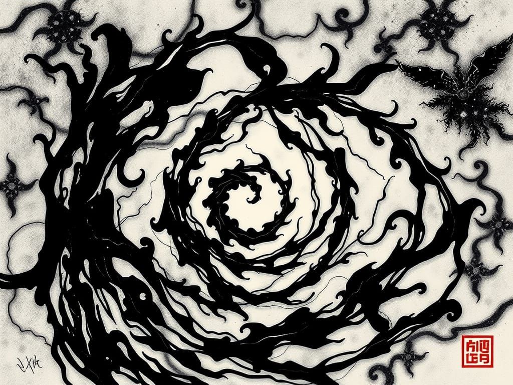 This image depicts a surreal, cosmic journey through an infinite spiral. It features flowing ink strokes and organic textures, creating a mystical and spiritual atmosphere.