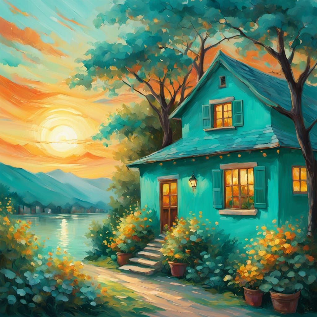A vibrant impressionist painting of a turquoise English village at sunset, light glowing from a window. Warm colors and soft brushstrokes create a serene, golden hour atmosphere.
