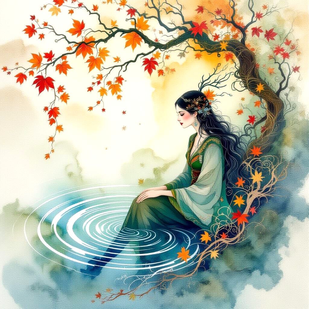 This image shows an abstract autumn equinox scene with organic, tangled shapes. The artwork evokes a fantasycore aesthetic with splashed watercolor effects and suminagashi-inspired marbling.