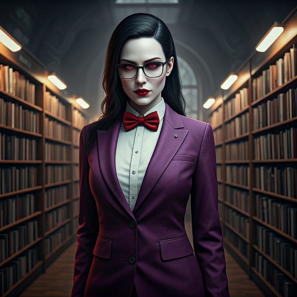 A stunning portrait of a beautiful, pale-skinned woman with vampiric red eyes, dressed in a fitted purple suit, standing in a library. The image showcases hyperrealistic, live-action style artistry with soft lighting and a neutral background.