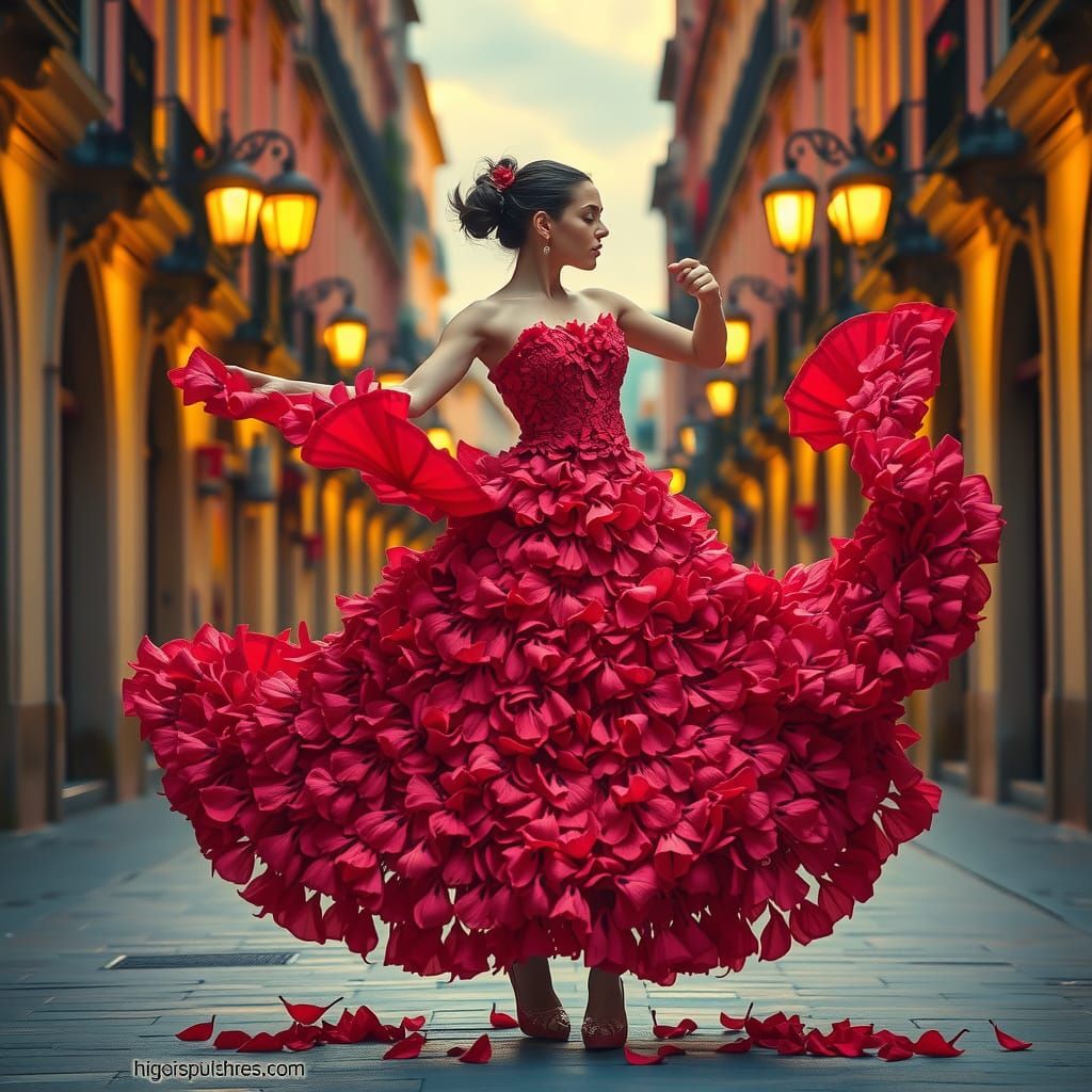 A vibrant image of a young woman in a red petal dress dancing under streetlights. The image showcases intricate details and surreal elements in an art nouveau style.