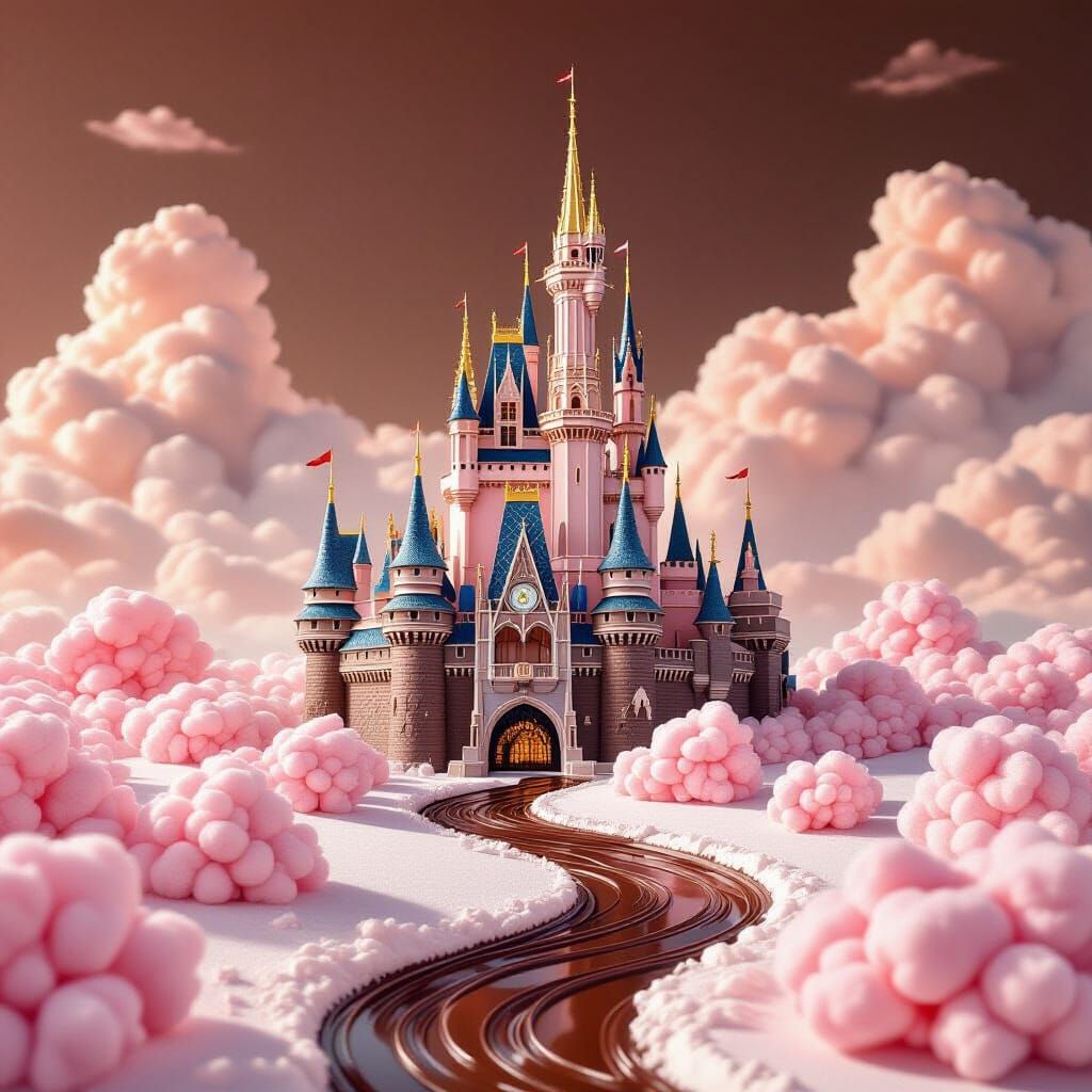 A stunningly realistic UltraHD image of a chocolate castle, bordered by pink cotton candy clouds and white powder, with a chocolate river flowing in front. HDR+ clarity enhances the velvety chocolate background.