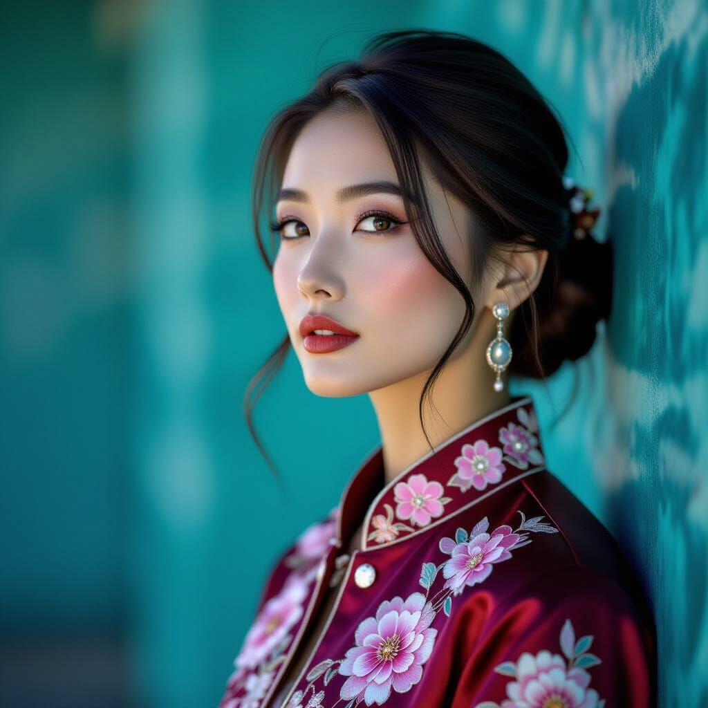 A captivating portrait in a side profile of a young Asian woman exudes quiet confidence. Her mesmerizing eyes and subtle, knowing smile are the focal points of the image. She dons a sophisticated burgundy satin jacket with intricate pink and silver floral designs, beadwork, and a peony motif. The jacket ...