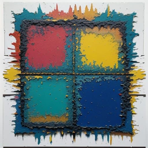 This abstract art features thick, textured paint drips in pastel green, blue, yellow, and magenta. Bold square and triangle patterns add a surreal, modern pop art feel.