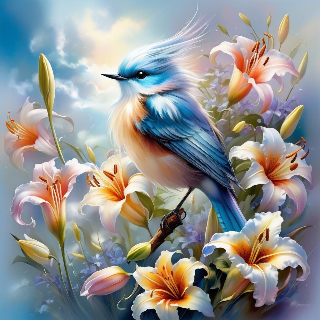 A beautiful image of a fluffy bird perched among lilies on clouds. The image evokes a dreamlike quality with intricate details and a watercolor aesthetic.