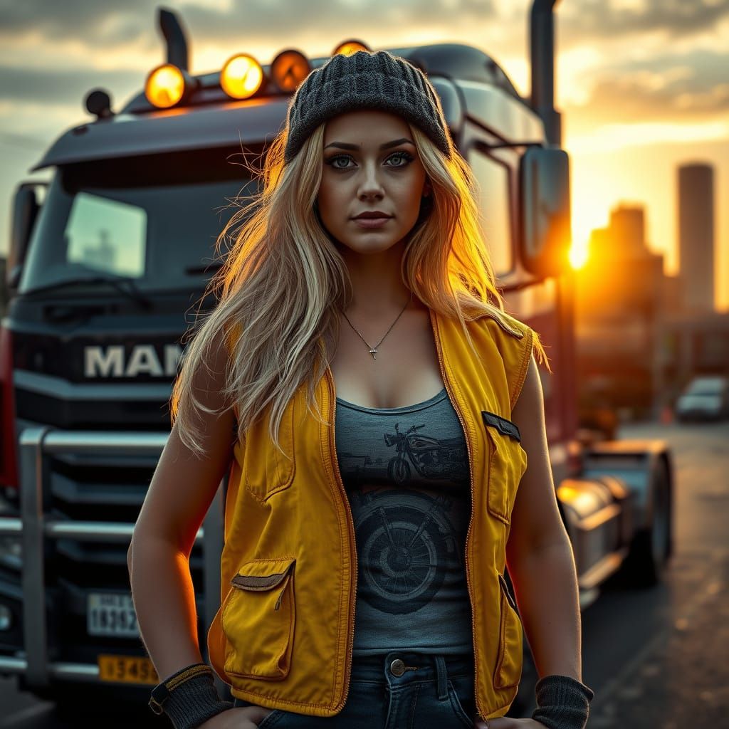 This image shows a confident female trucker with long blonde hair in front of her truck. She wears a weathered vest and tank top, set against a warm sunset in cinematic photorealism with gritty textures.