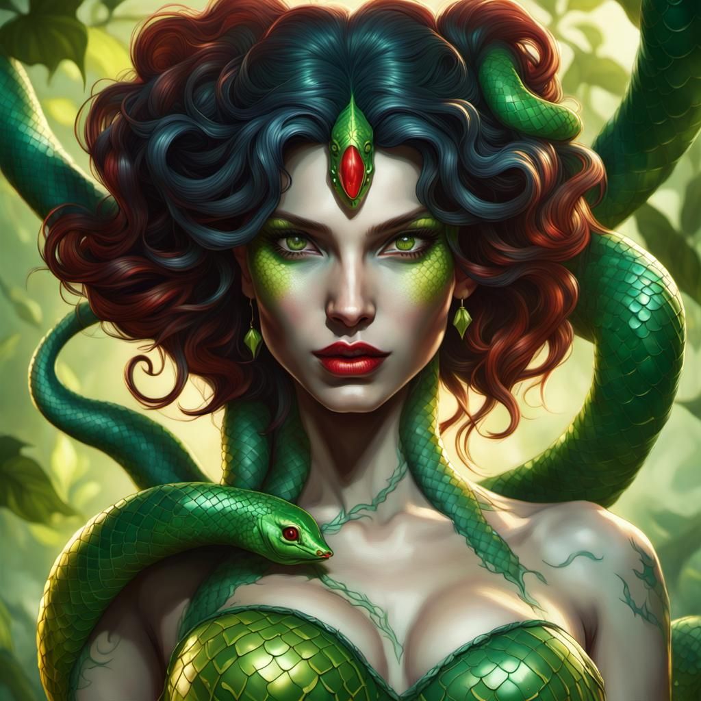 A detailed portrait of Medusa with venomous green snakes for hair and poison ivy details. The image features dynamic lighting and intricate details in a splash art style.