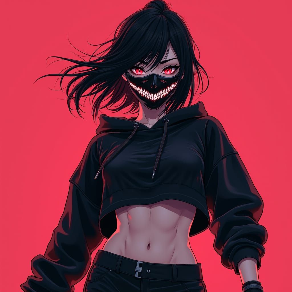 A striking female figure with pale skin, red eyes, and raven-black hair, adorned with a black oni mask and high-tech gear, exuding a captivating and mysterious aura in a futuristic, neon-lit world.