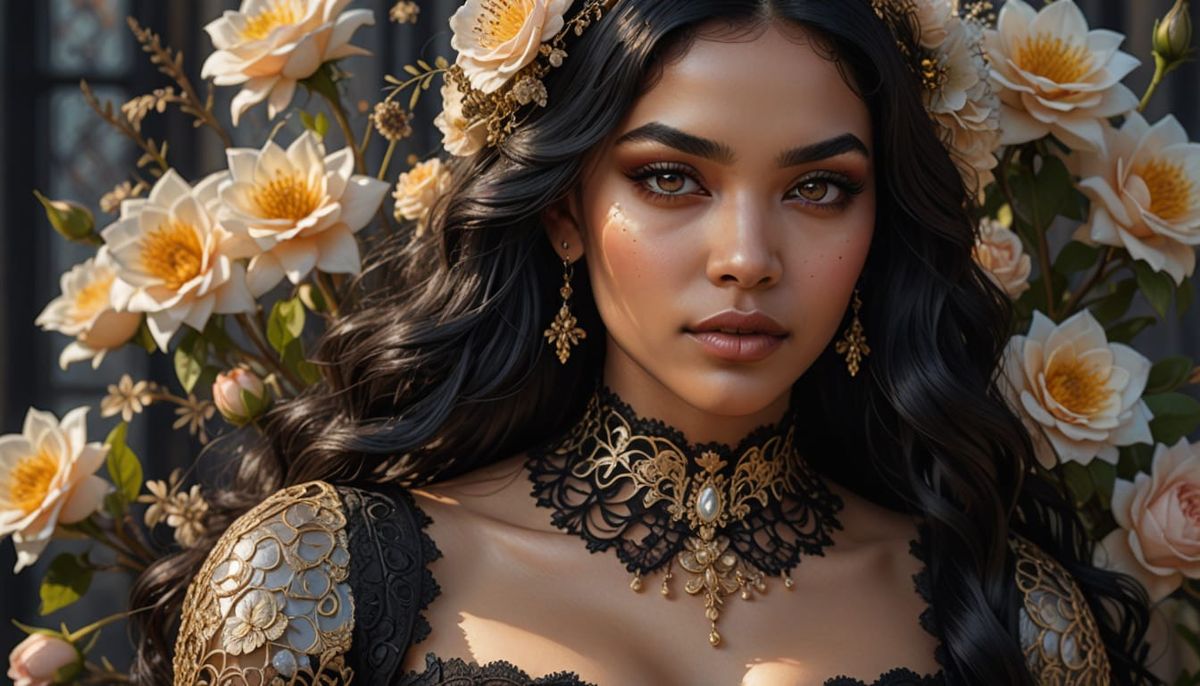 A close-up portrait of a striking 22-year-old Dominican woman with black hair and gray eyes. She wears a gothic corset and science fiction wedding dress with floral patterns in a digital art style.