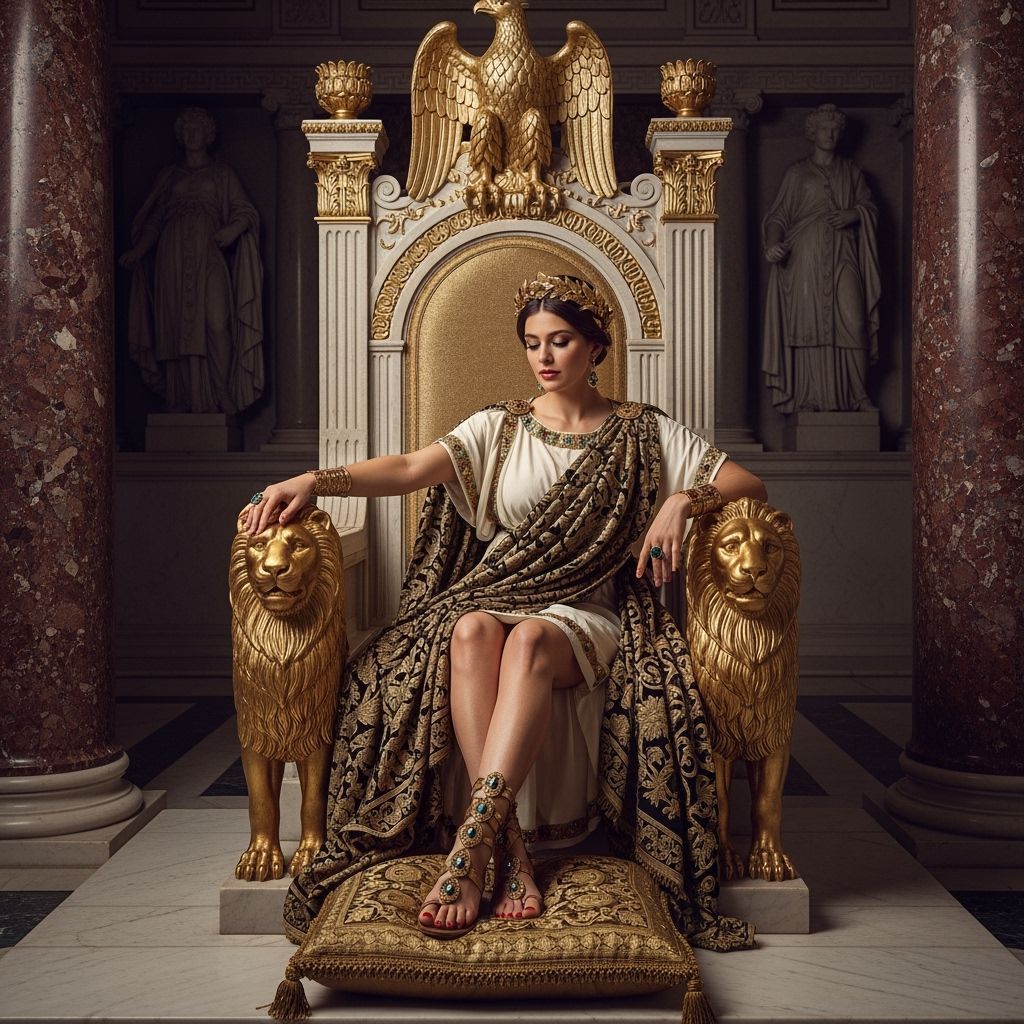 This image shows a Roman Empress on a marble throne, wearing gold and emerald jewelry. The throne room features marble columns and gold ornaments, captured with professional photography techniques.