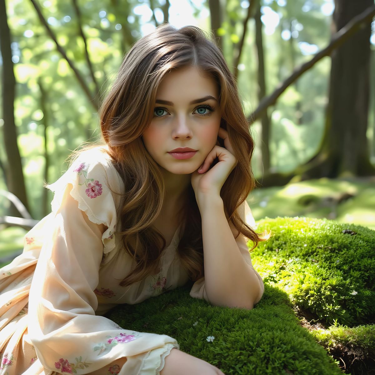 This image shows a woman in a wildflower gown reclining in a mossy grove. Sunlight dapples her face in this digital painting, rendered with soft edges and a harmonious color palette.