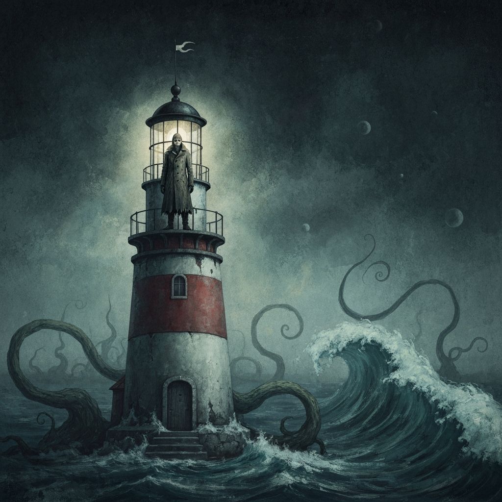 A dark and surreal picture of a lighthouse keeper on a rugged, wave-battered lighthouse. The style blends surrealism, abstract-expressionism, and whimsy with impasto gouache and watercolor brushstrokes, creating a haunting, eerie landscape.