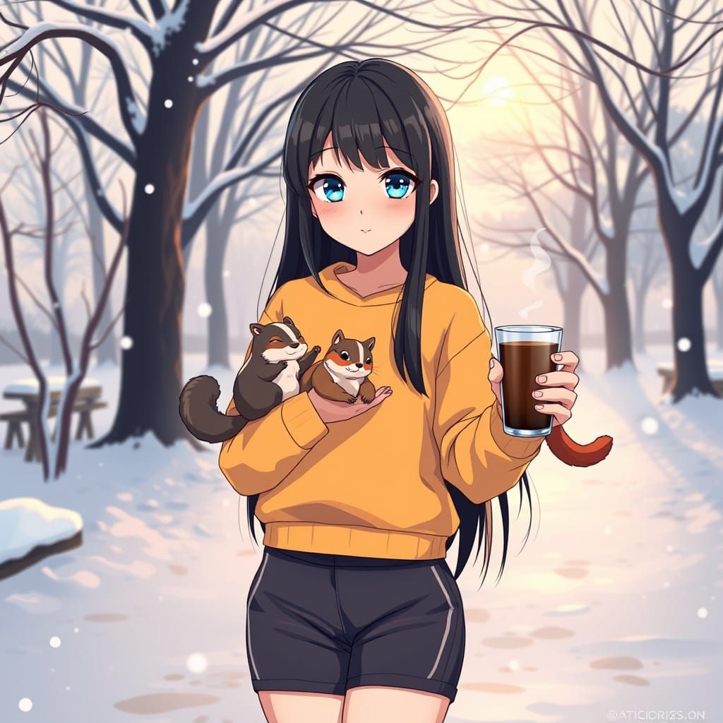 This image depicts a cute anime girl with long black hair and blue eyes in a snowy park. She's holding coffee and cuddling squirrels in a Korean manhwa style with cel-shaded effects.