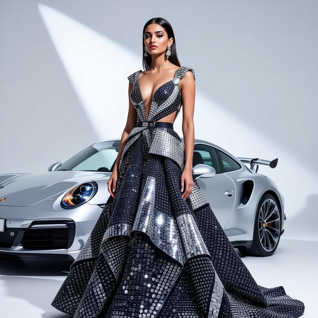 A striking black-and-white studio portrait of a modern girl wearing a unique haute couture gown made of Porsche 911 metallic panels and crystals. Dramatic lighting highlights the reflective surfaces and cascading sparkle.