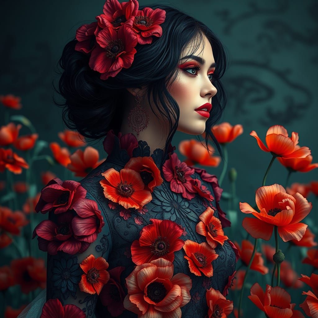 a painting of a woman surrounded by flowers, inspired by Wadim Kashin, gothic art, poppy, beautiful art uhd 4 k, girl with black hair, purple and red colors, dressed in a flower dress, black and red colors