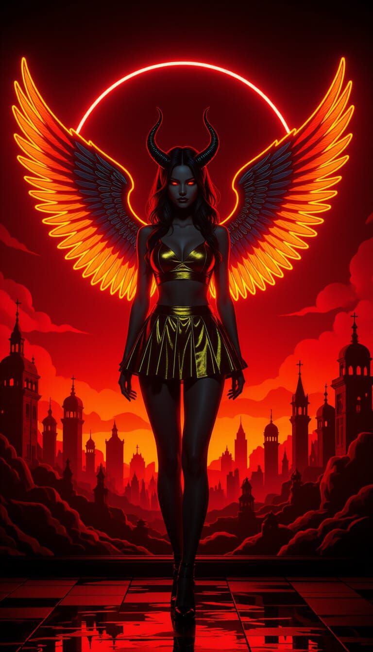 This image shows a neon silhouette of a half-demon angel girl with wings. The artwork features a hellish landscape backdrop illuminated by contrasting red and orange neon lights in a fantasy neon art style.