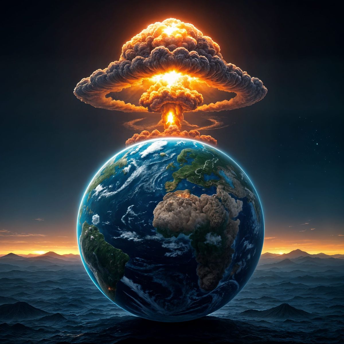 This image depicts a cartoon Earth with a mushroom cloud erupting from its surface. The digital matte painting style suggests a dramatic and intricately detailed scene.