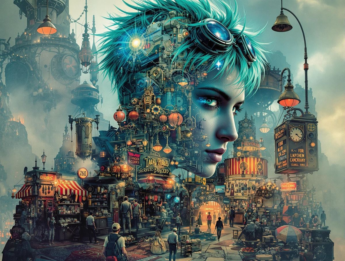 A striking picture of a dieselpunk explorer's face double-exposed with a busy steampunk marketplace. The image is cinematic and atmospheric with a dark fantasy flair, reminiscent of art nouveau.