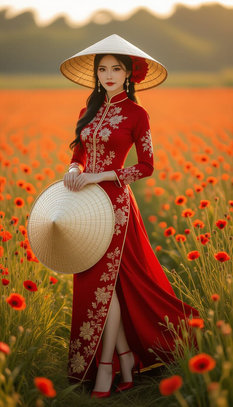 This image shows a Vietnamese woman in traditional dress on a flower-filled meadow. The photorealistic portrait features cinematic lighting, warm colors, and stylistic elements reminiscent of 35mm film photography.