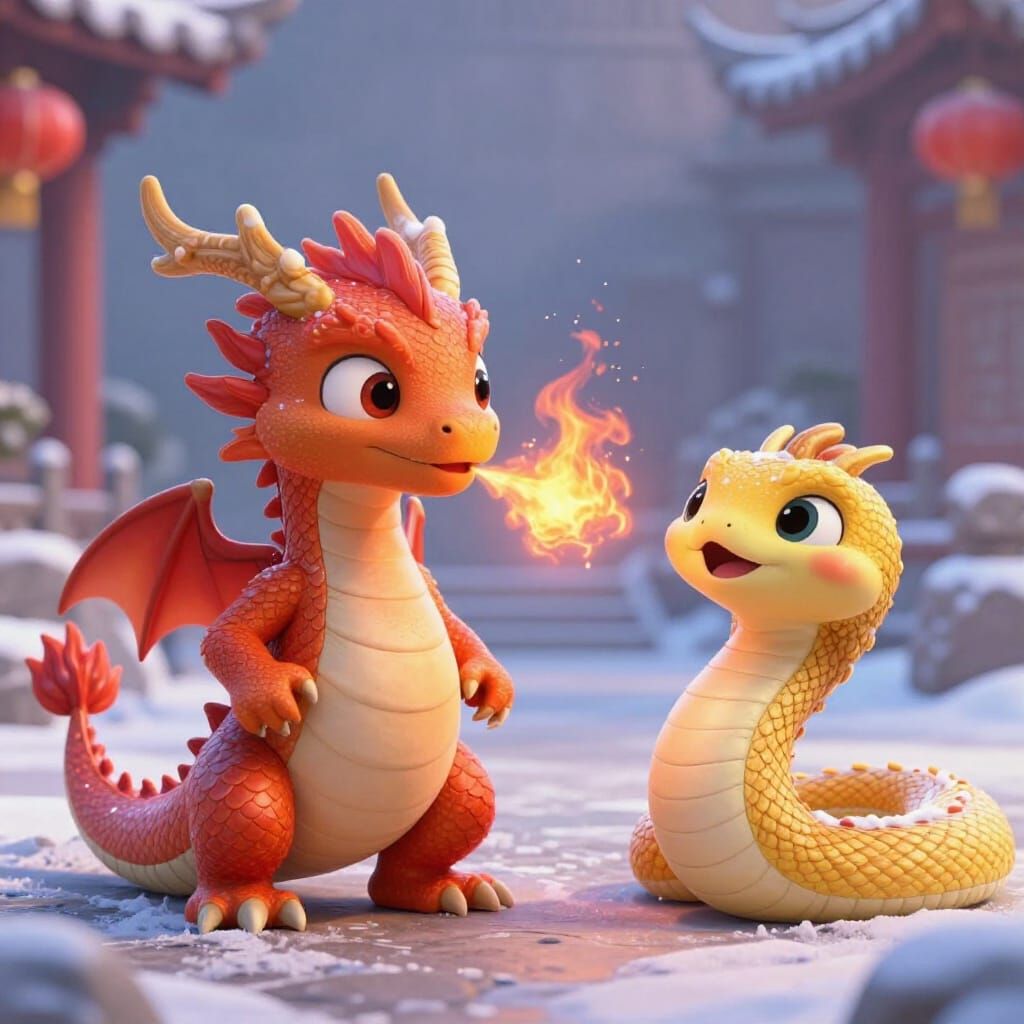 This image shows two adorable baby dragons, one breathing fire and a serpent dragon laughing, in a snowy courtyard. Rendered in a detailed Pixar style with vibrant colors and soft lighting.
