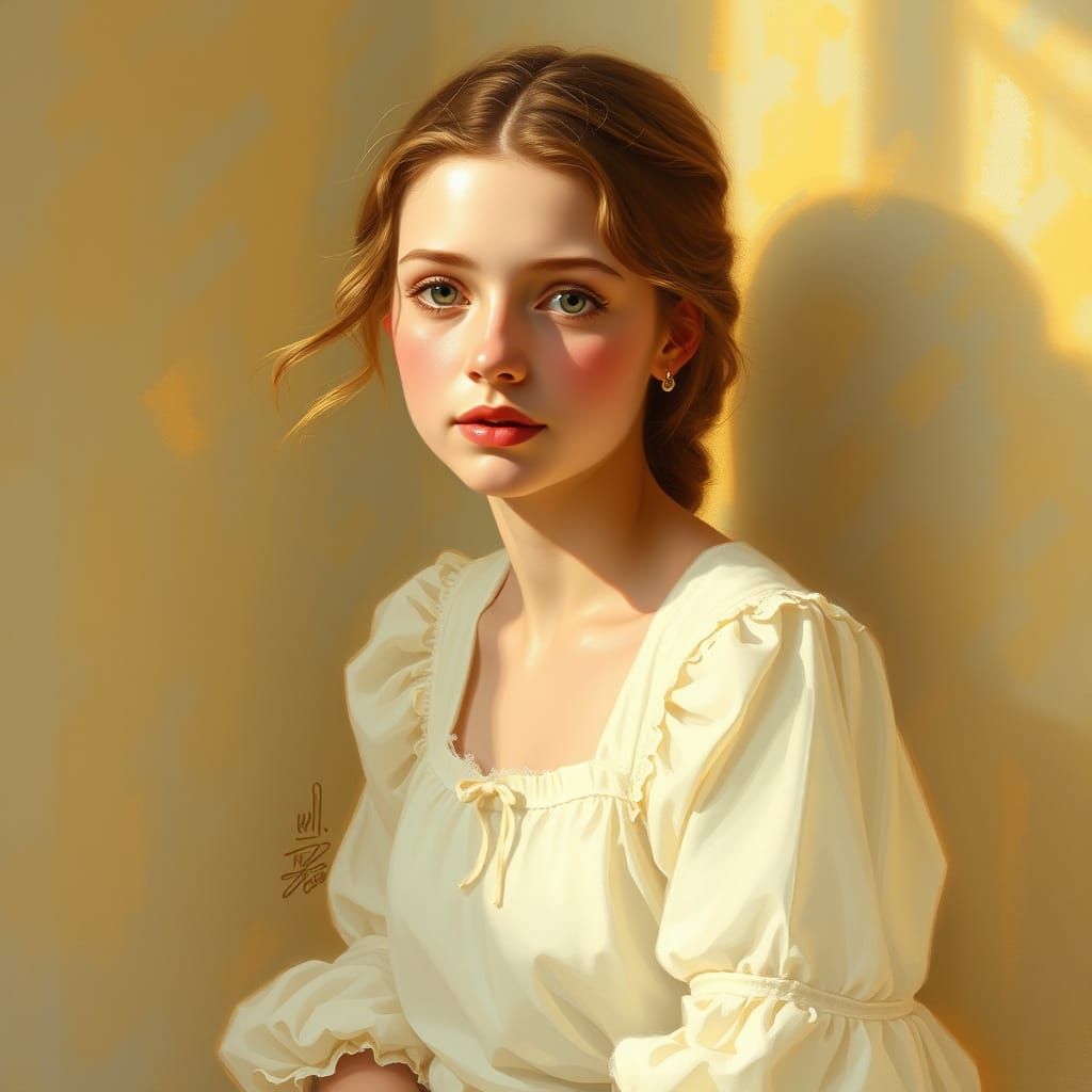A peaceful image of a woman in a white dress bathed in golden light. The artwork evokes impressionist paintings through soft brushstrokes and a calming color palette.