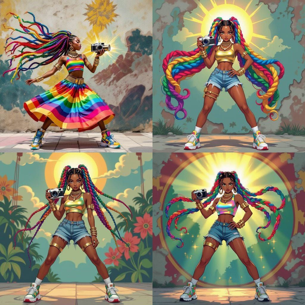 This image shows a Black teenage girl with rainbow braids in front of a Cuban mural. She is holding a glowing camera in a dynamic pose, rendered in an anime style.