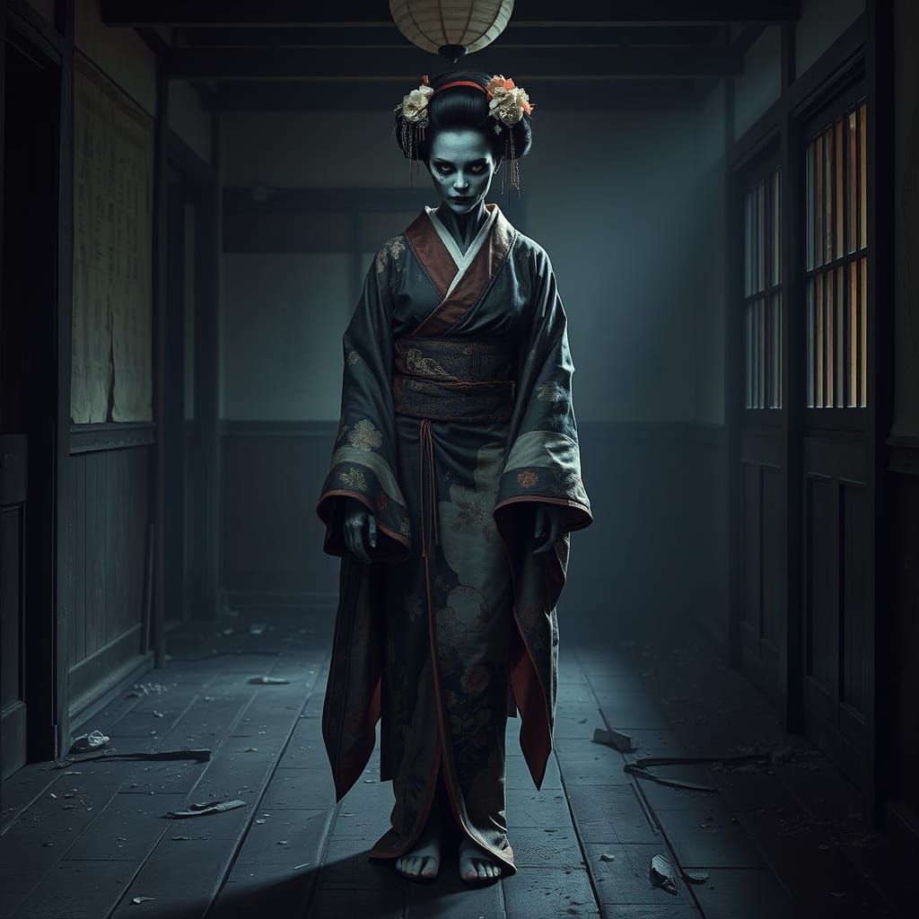 A haunting image of a zombie geisha in a dilapidated Japanese house. The intricate robe is torn and dirty, set against a backdrop of muted colors and eerie lighting, in a dark digital art style.