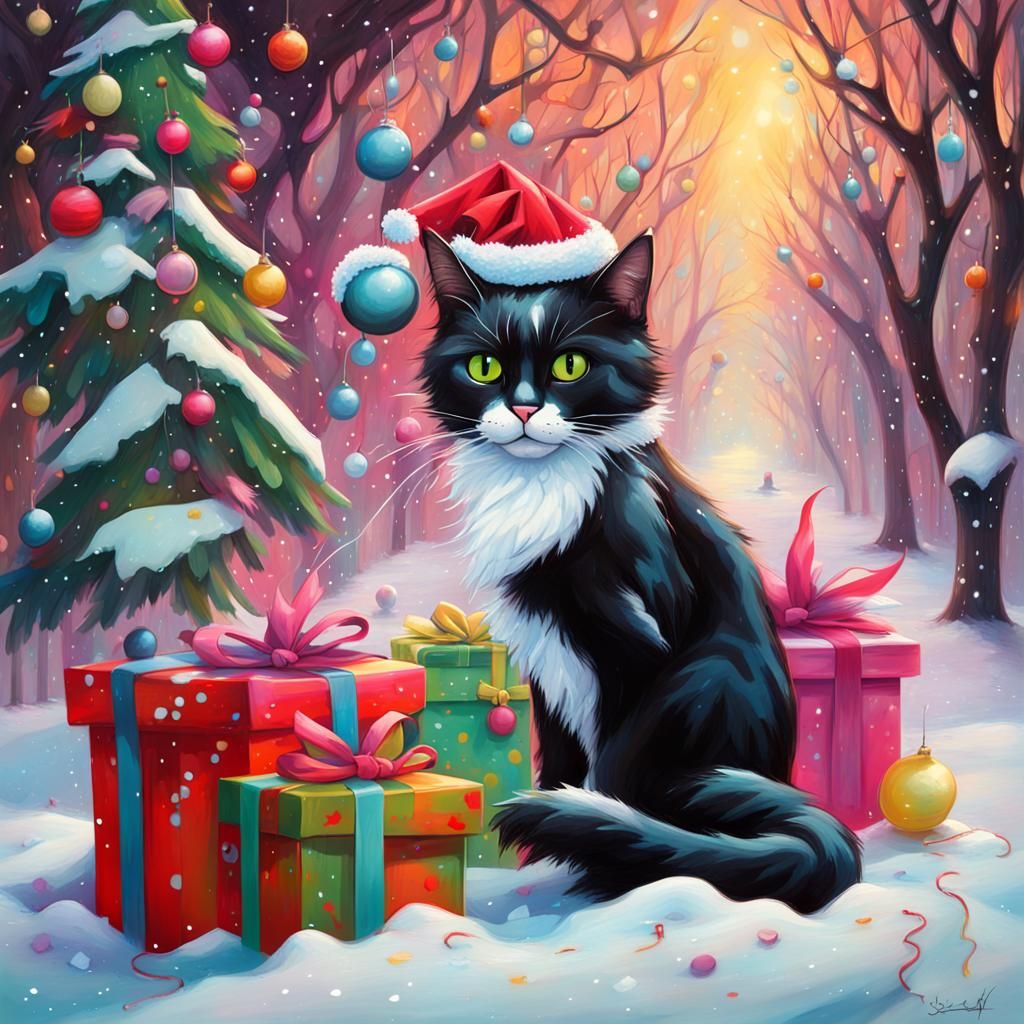 A vibrant graffiti art image depicting a tuxedo cat amidst sugar plum fairies, Christmas snow, trees, and presents. The artwork is a colorful, high-contrast splash art piece.