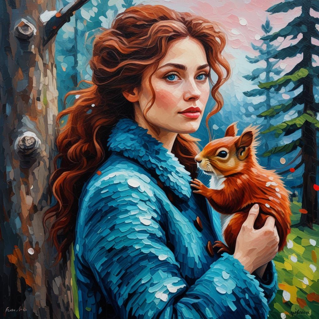 This neo-impressionist oil painting features a young woman in a blue fur coat with pearl trim, standing by a spruce tree and holding a red squirrel. Textured thick paint and vibrant colors create an emotional, atmospheric scene.