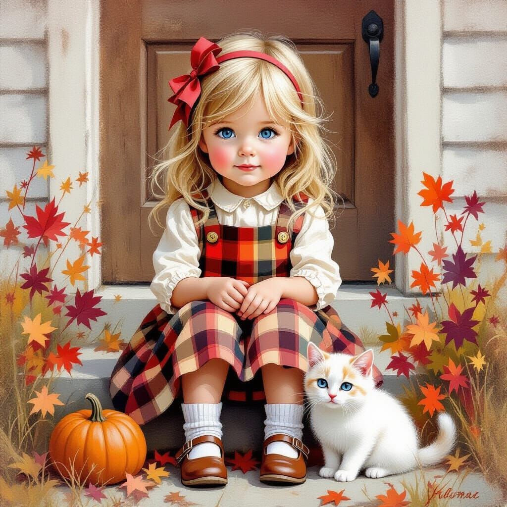 This image captures a young girl with blonde hair and blue eyes in a plaid skirt, playing with her white cat in a colorful autumn garden. The art style blends airbrushed, watercolor, and acrylic techniques.