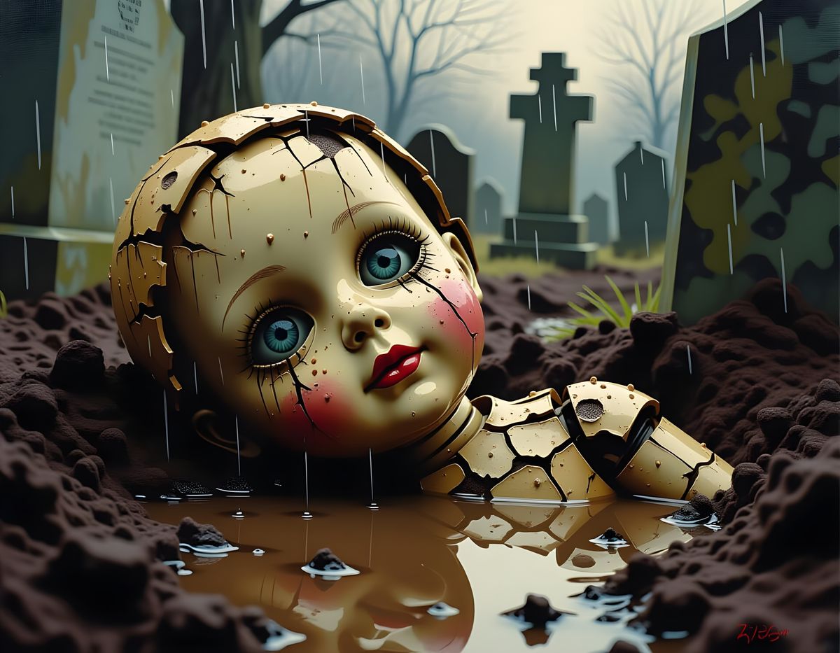 Oil painting. Extreme close-up. A decaying biomechanical doll lies half-buried in a muddy graveyard. Raindrops glisten on its cracked surface. The doll's vacant eyes stare blankly into the camera. Inspired by Zdzisław Beksiński and H.R. Giger. Dark, muted colors. High contrast. A masterpiece, best quality, 8k resolution, trending on Artstation, Unreal Engine 5, intricate detail, dramatic composition.