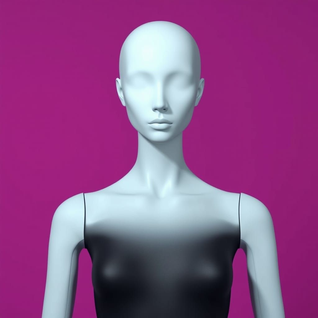 A minimalist portrait of a mannequin in a sleek black bodysuit, standing against a vibrant magenta background, with a smooth, featureless face and hollow eye sockets.