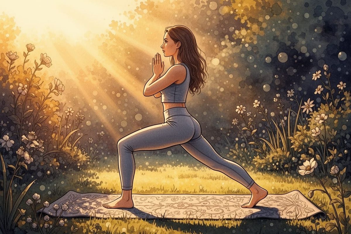 This image shows a woman doing yoga in a garden during sunrise. It is created in a detailed liquid ink watercolor style, conveying peace and tranquility with dramatic natural lighting.