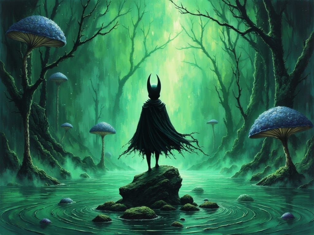 This artwork features Hollow Knight on a rock in a glowing green lake, with plants and fungi. It uses a blend of ink, pencil, and watercolor techniques, with dramatic lighting.