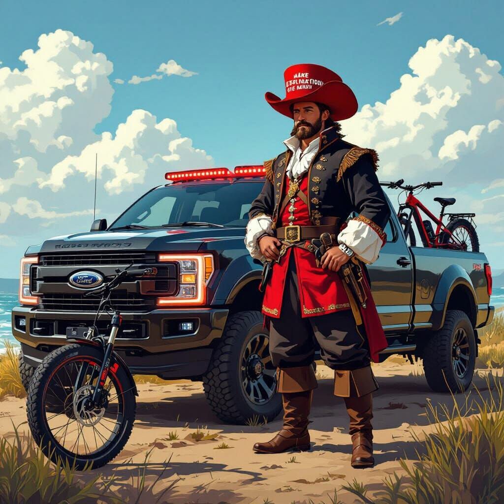 This image shows Jacques Cartier in period clothing sporting a red cap next to a lowered black Ford F-350 with red LEDs and a Surron e-bike, creating a blend of historical and modern elements in a futuristic style.
