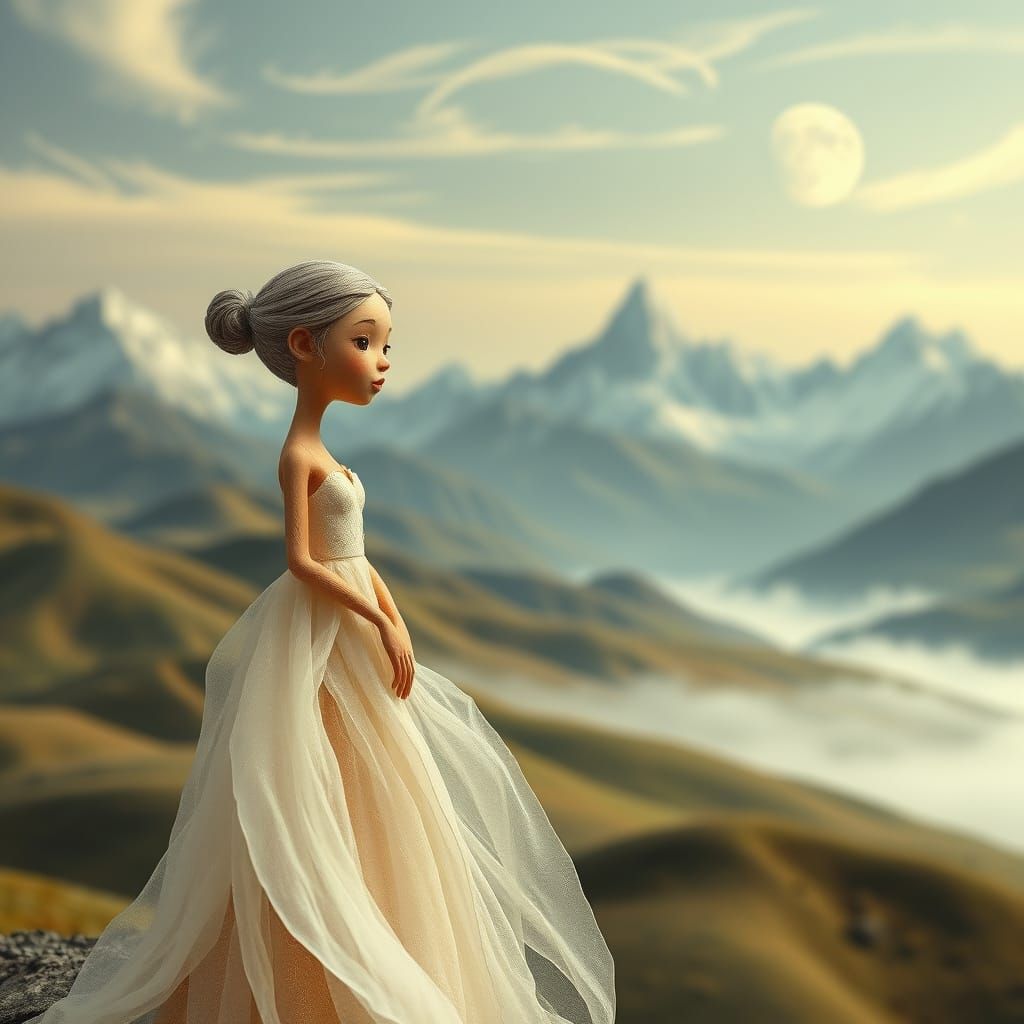 This image depicts a serene, porcelain-skinned woman in a flowing gown, set against a surreal, rolling hillscape with snow-capped peaks and wispy clouds, evoking a dreamlike atmosphere reminiscent of stop-motion and fantasy art.