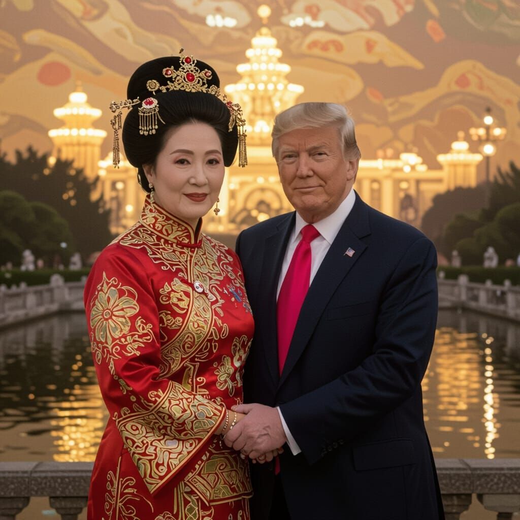 This image depicts Empress Cixi and Donald Trump in a glowing oasis, bathed in warm, volumetric light with red and golden hues, in an impressionistic painterly style.