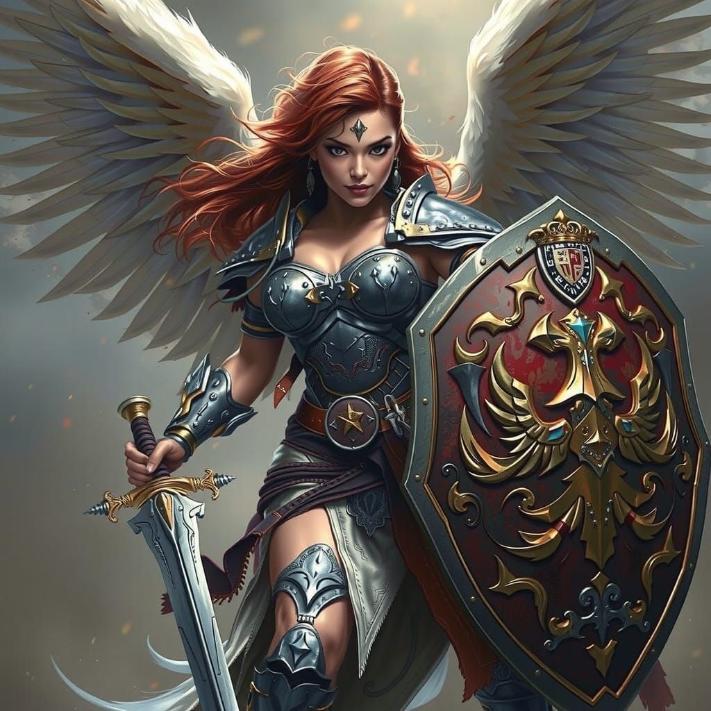 This image shows a regal female warrior in gleaming light battle armor, with a sword and shield, and large wings spread wide behind her, in a photorealistic and high-contrast style