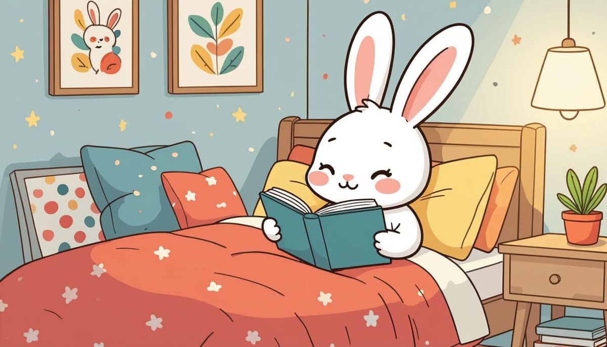 Easily generate adorable bunny reading scenes in a cozy bedroom, perfect for children's coloring books. Try it free!