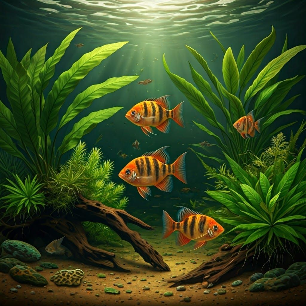 This image shows a vibrant underwater world with a school of tropical fish swimming among lush submersed plants and Amazon Swordplants. Driftwood and muddy sand create a natural habitat, depicted in a highly realistic and detailed painting style.