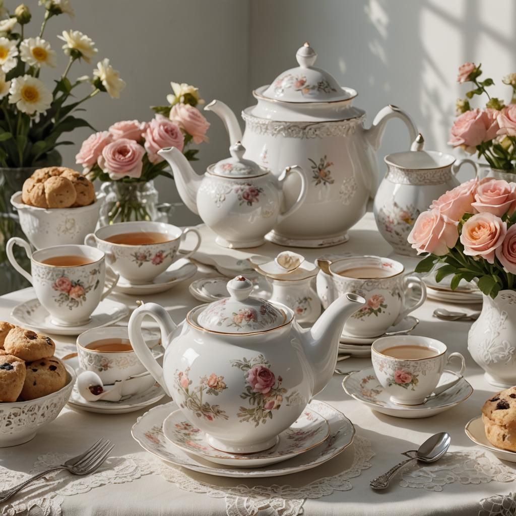 A hyperrealistic image showing a porcelain teapot with floral design on a lace-covered table. Matching teacups, silver spoon, and scones are arranged in a bright, sunlit room with a garden view.
