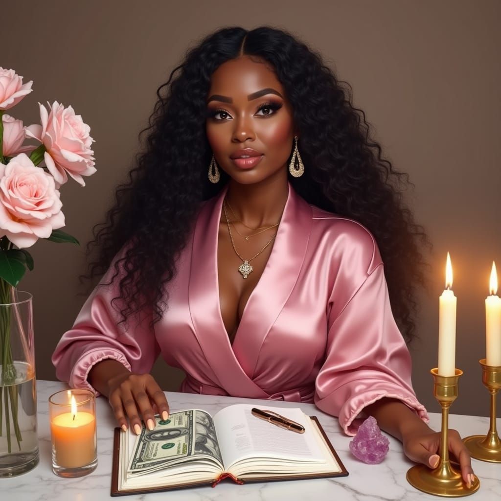 This image shows a glamorous African American woman in a pink robe at a marble desk. Surrounded by luxury items, she embodies a boss babe aesthetic in a blend of boho chic and luxury lighting.