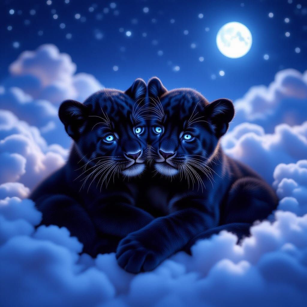 This image captures two black panther cubs cuddling amidst glowing, ethereal clouds under a starry night sky. Moonlight illuminates their fur and blue eyes, creating a mystical and serene atmosphere.
